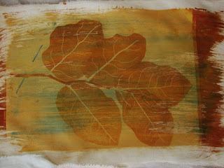 Not great results here. I used Inktense blocks rubbing over a leaf plate. I did dampen the fabric the rubbed the block over the plate. But it's a good start for more layering of another technique!